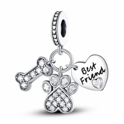 Pandora kompatibilis kutyás medál tappancs, csont és "Best Friend" motívummal, elegáns és játékos dizájnnal. Tökéletes ajándék kutyabarátoknak