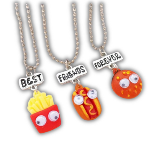 Háromrészes barátság nyaklánc hamburger, sültkrumpli és hot-dog medálokkal – tökéletes ajándék legjobb barátoknak! Vidám és különleges BFF ékszer szett
