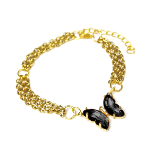 1 kép Háromsoros divat karkötő fekete kristálypillangós charmmal, arany színű