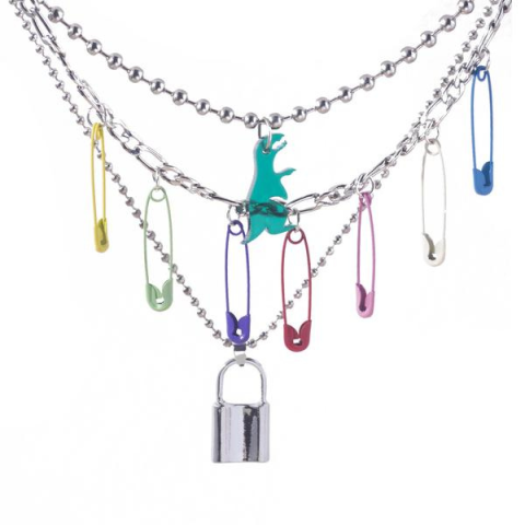 Többsoros nyaklánc színes medálokkal: lakat, dinó és biztosítótűk. Különleges és trendi kiegészítő a modern stílus kedvelőinek