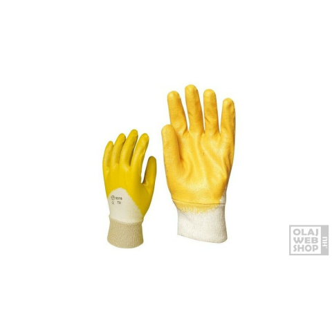 Nitril, sárga munkavédelmi kesztyű. • Kötött pamutkelméből varrt • Nitrilbe félig mártott kék kesztyű • Rugalmas kötött mandzsettával