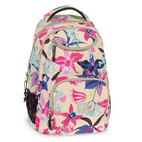 Hátizsák iskolai ARS UNA AU-6 Beach Flowers Prémium minőségű, vízlepergető anyagból készült hátizsák, YKK cipzárral. Hátrésze, alja és fogantyúja szivacsos erősítéssel. Vállpántjai szivacsosak, állíthatóak, mellkaspántja állíthatóak és leszedhetőek, ci
