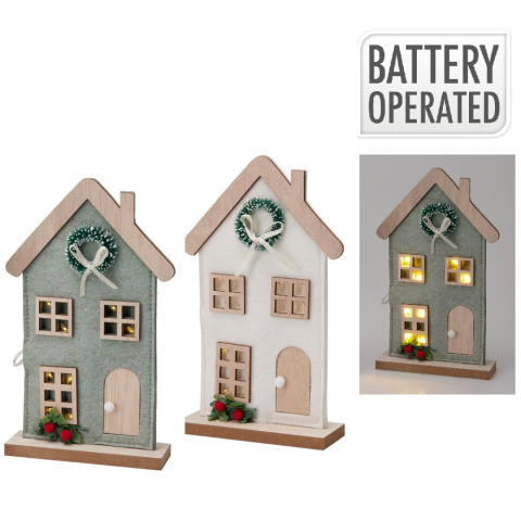 Házikó 8 LED-es filc fa talpon M18cm dekorációs kellék árgrafikon