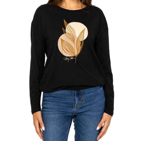 Női hosszú ujjú póló, bővebb szabással, ejtett vállal, kerek nyakkal, gumírozott aljjal, modállal kevert pamut anyagból, elején nyomott és bársonyos dekorációval, hátán kis fém márkajelzéssel