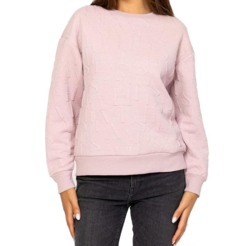Női pulóver, bővebb szabással, kerek nyakkal, ejtett vállal, bordás passzés aljjal és kézelővel, logó mintával, kis márkajelzéssel az eleje alján