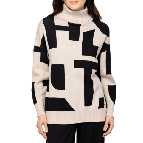 Női kötött, garbó nyakú pulóver, bővebb, hosszabb szabással, ejtett vállal, belekötött logó mintával, kis fém márkajelzéssel az eleje alján