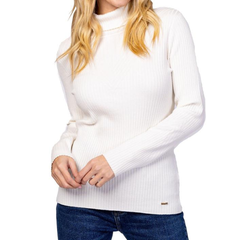 Női kötött, garbó nyakú pulóver, alakra szabott fazonnal, bordázott mintával, kis fém márkajelzéssel az eleje alján