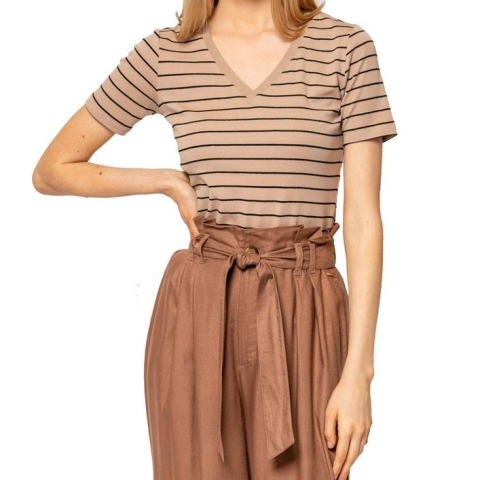 Női rövid ujjú póló, enyhén karcsúsított szabással, v-nyakkal, csíkozásba beleszövött lurex szállal, elasztánnal és modállal kevert vékony pamut anyagból, oldalában szövött márkajelzéssel