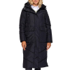 Női utcai steppelt télikabát, egyenes szabással, vádli középig érő hosszal, állítható fix kapucnival, patentos külső és belső szélfogóval, állítható derékkal, ujja alján bordás passzés kézelővel, oldalában cipzáros hasíté