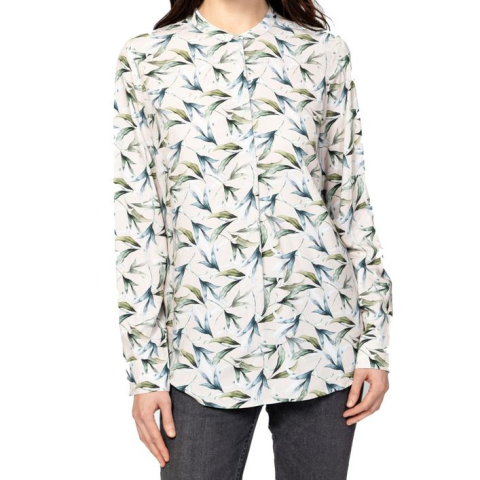 Női ingblúz bővebb szabással, dekoratív gallér megoldással, rejtett gombolással, gombos kézelővel, könnyen kezelhető viszkóz anyagból, sikkes mintákkal, kis fém márkajelzéssel a hátán