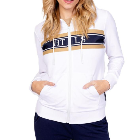 Női kapucnis pulóver, testhez álló fazonnal, cipzáros záródással, bordás passzés aljjal és kézelővel, egyenes zsebekkel, magas pamut tartalmú anyagból, nagy márkajelzéssel az elején
