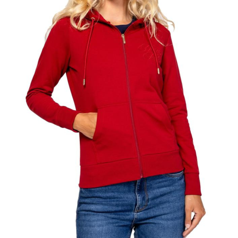 Női kapucnis pulóver, testhez álló fazonnal, bordás passzés aljjal és kézelővel, cipzáros záródással, kenguruzsebbel, brand színekben, magas pamut tartalmú anyagból, kis hímzett márkajelzéssel az elején