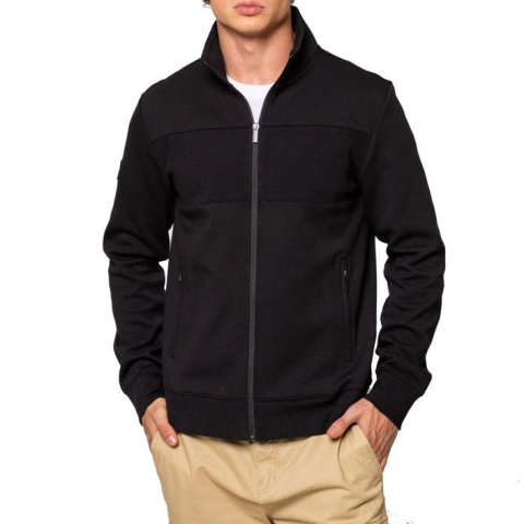 Férfi cipzáros, állógalléros pulóver, két féle anyagból, klasszikus szabással, cipzáros zsebekkel, bordás passzés aljjal és kézelővel, 3D szilikon márkajelzéssel a jobb karján