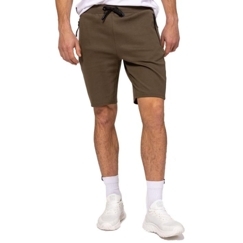 Férfi pamut rövidnadrág, kényelmes szabással, húzózsinórral állítható, elasztikus derékkal, cipzáros zsebekkel, hátsó zsebbel, oldalában logózott dekor szalaggal, hátán kis márkajelzéssel