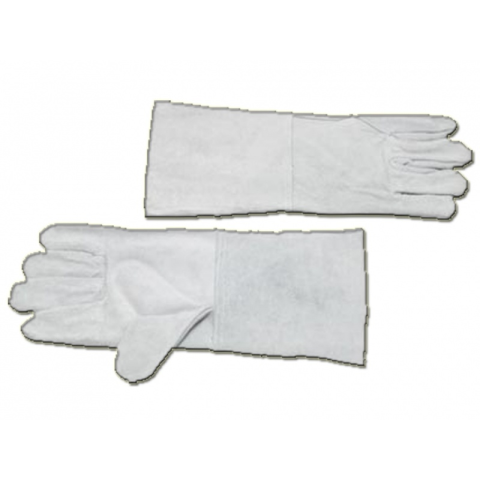 Marhahasítékból készült hegesztőkesztyű 15 cm-es marhahasítékos mandzsettával olvadt fémcseppek elleni védelemre.