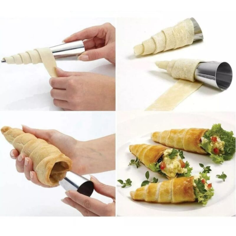 Használata: A leveles tésztát vékonyra nyújtjuk, 1 cm-es csíkokat vágunk és a mini tekercsre felcsavarjuk úgy, hogy a csíkok szélei fedjék egymást. Úgy helyezzük a sütőlemezre, hogy a végek alulra kerüljenek. Forró sütőben, erős lángon pirosra sütjük. Még melegen lehúzzuk a formákat úgy, hogy tenyerünkkel átfogjuk a tekercset és másik kezünkkel a formát megcsavarva a tésztából kihúzzuk. A te
