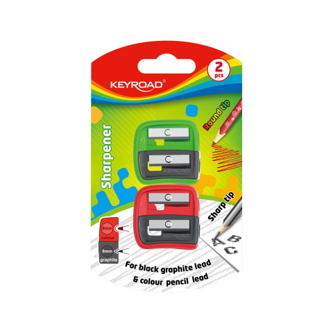 HEGYEZŐ, 2 LYUKÚ, 2 DB/BLISZTER, KEYROAD DOU-POWER, VEGYES SZÍNEK Dupla erő! Kompakt, 2 lyukú ceruzahegyező 8 mm-es lyuk színes- és grafit ceruzákhoz 2 az 1-ben funkció (hegyes és tompa hegyezés). vegyes színekben (kék, narancssárga, zöld és piro