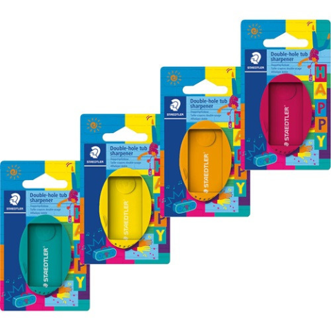 Hegyező Staedtler Happy 2 lyukú műanyag bliszteres vegyes színek 2 lyukú, műanyag hegyező forgácstartállyal4 vidám szín: franciazöld , sárga, világos narancs, bordóNormál méretű grafit ceruzákhoz 8,2 mm átmerőig, 23°-os élezési szöggel a tiszta és pont