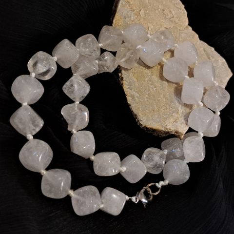 Hegyikristály gyöngysor – Ez a különleges gyöngysor természetes, áttetsző hegyikristályból készült, melynek letisztult szépsége és nyugtató energiája tökéletes harmóniát sugall. A szabálytalan, mégis kifinomult formák minden