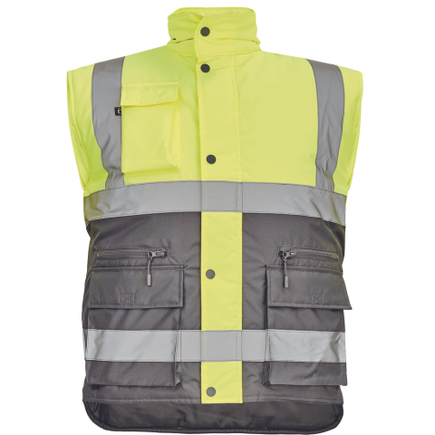 HELLIN HV mellény sárga/szürke 3XL • Hi-Vis bélelt férfi mellény, gallérba rejtett kapucnival • 5 cm széles fényvisszavető csíkok • patentos hajtókával fedett cipzáras kialakítás • telefonzseb • 2 nagy zsebfedős első zseb és 2 cipzáras zseb
