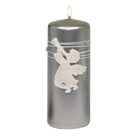Ezüst alapon angyal mintával ellátott henger gyertya, mérete: 15 cm x 7 cm, ideális része lehet a karácsonyi dekorációnak.
