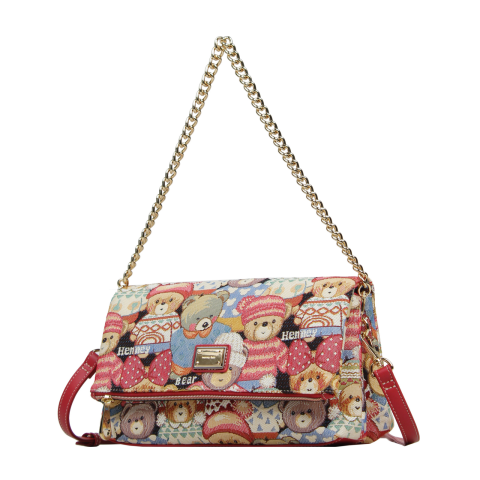 A Henney Bear CUTE BEAR női válltáska, kézitáska bájos és vidám megjelenésével hódít. A gobelin szövetet színes, kötött ruhás mackók díszítik, akik játékos és kedves hangulatot árasztanak. A piros műbőr részletek és az aranyszínű láncos pánt elegánsan keretezik ezt a fiatalos, mégis praktikus modellt.