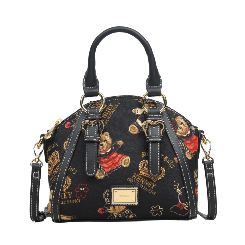 A Henney Bear CROWN BEAR válltáska, kézitáska játékos, mégis elegáns megjelenést kínál. A fekete alapon arany és piros árnyalatokban megjelenő koronás mackók vidám, királyi hangulatot árasztanak. A praktikus és stílusos kialakítás mindennapi használatra is tökéletes választás.