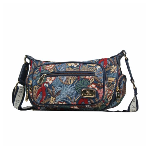 A Henney Bear PARROT SONG női válltáska trópusi hangulatot varázsol a mindennapokba. A színes papagájokat, virágokat és leveleket ábrázoló gobelin mintázat élénk és játékos összhatást kelt, miközben a praktikus belső elrendezés és az elegáns fém kiegészítők kifinomult stílust sugallnak.
