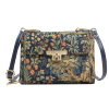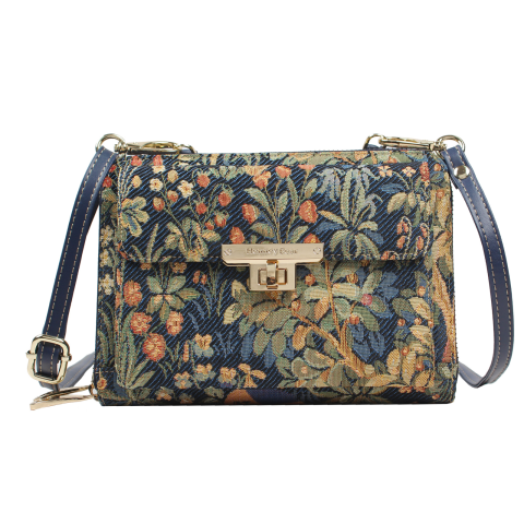A Henney Bear WALKING THE FOREST válltáska sűrű, részletgazdag erdei motívumaival természetközeli, harmonikus megjelenést kínál. A mélyzöld, kék és aranyszínű árnyalatokkal átszőtt gobelin szövetet elegáns sötétkék műbőr részletek egészítik ki.