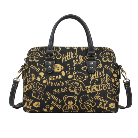 Stílusos és praktikus női kézitáska a Henney Bear-től, fekete textilborítású alapját karakteres arany medve minták és kézzel írt hatású feliratok borítják. Vidám, mégis elegáns darab. Letisztult eleganciája és praktikus kialakítása tökéletes választás mindennapokra és különleges alkalmakra is.