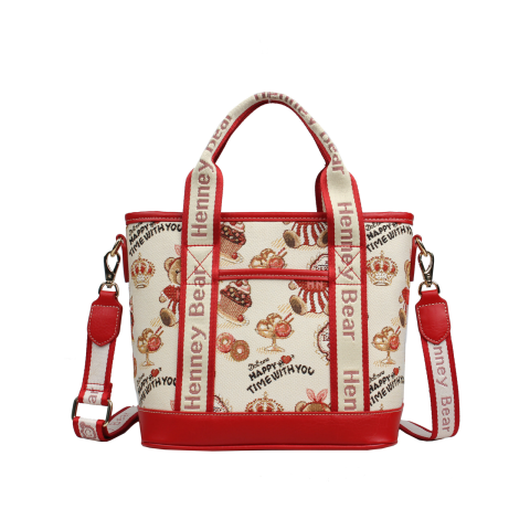 A Henney Bear CAKE BEAR női válltáska elegáns és praktikus kiegészítő. Krém színű alapon illusztrált sütemények, torták, fagylaltkelyhek és koronák meseszerű hangulatot teremtenek. A fő motívum egy bájos kislány maci, amelyet jellegzetes piros kiegészítők egészítenek ki, vidám és játékos karaktert adva a designnak. Tágas, béléssel borított belsejében cipzáras rekesz és biztonsági zseb segíti a rendszerezést. Prémium műbőr részletei, ezüst kiegészít