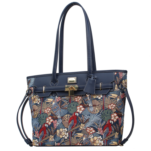 A Henney Bear PARROT SONG női válltáska, kézitáska különleges és feltűnő darab, amely trópusi hangulatot áraszt. A gazdag gobelin stílusú minta egzotikus papagájokkal, buja levelekkel és színes virágokkal díszített, mely vidám és elegáns összhatást teremt. A tágas belső tér, a praktikus rekeszek és a sötétkék műbőr részletek garantálják a kényelmet és a kifinomult megjelenést.