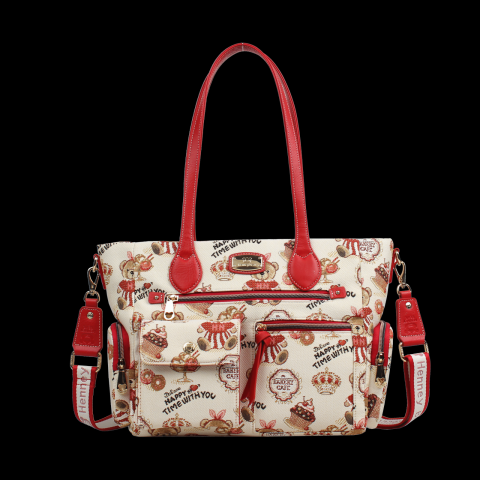 A Henney Bear CAKE BEAR válltáska, kézitáska vidám és játékos süteményes–mackós mintájával azonnal mosolyt csal a viselője arcára. A krémszínű gobelin szövetet élénk piros műbőr részletek és praktikus külső zsebek egészítik ki, így a táska egyszerre látványos és kimondottan jól használható a mindennapokban.