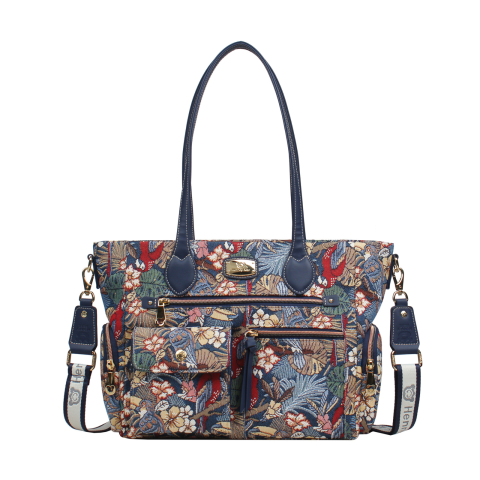 A Henney Bear PARROT SONG női válltáska, kézitáska trópusi hangulatot varázsol a mindennapokba, amelyet a színes papagájokkal és virágokkal díszített gobelin minta tesz különlegessé. Praktikus rekeszei, kényelmes pántjai és aranyszínű fém kiegészítői prémium megjelenést biztosítanak.