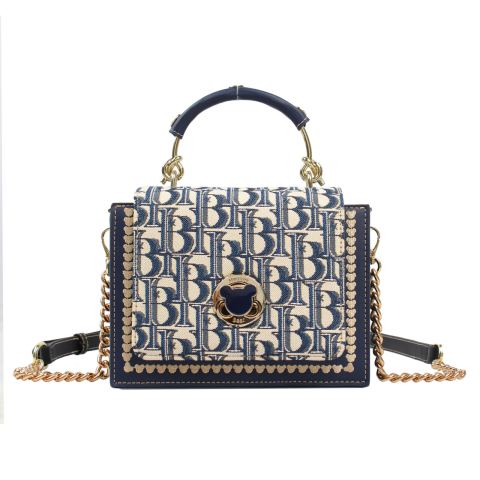 A Henney Bear HB BLUE válltáska/kézitáska elegáns és modern megjelenést kínál a letisztult, monogram jellegű mintázatával. A krémszínű és mélykék gobelin szövet harmonikus összhangot alkot, amelyet a sötétkék műbőr elemek és az aranyszínű fémkiegészítők még kifinomultabbá tesznek. A dekoratív peremdíszítés és a jellegzetes kör alakú, medveformát idéző fémzár különleges karaktert ad a táskának. A levehető láncos vállpántnak köszönhetően a m