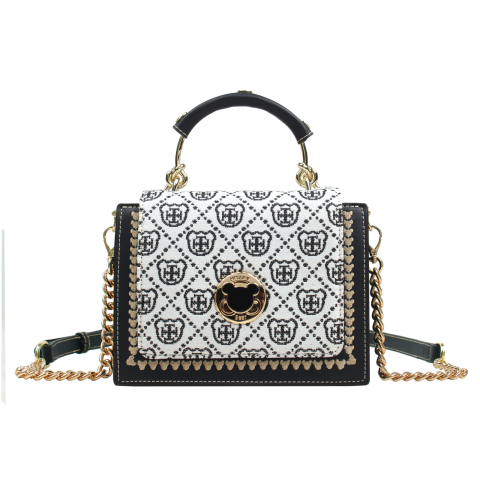 A Henney Bear PT BEAR válltáska/kézitáska elegáns, modern és letisztult megjelenést kínál. A fekete–fehér gobelin szövetet ismétlődő, stilizált medvefejes mintázat díszíti, amely egyszerre klasszikus és játékos. A fekete műbőr részletek, az aranyszínű fémkiegészítők és a jellegzetes medveformájú díszzár prémium hatást kölcsönöznek a táskának. A láncos vállpánt levehető, így többféle viselési módot is biztosít.