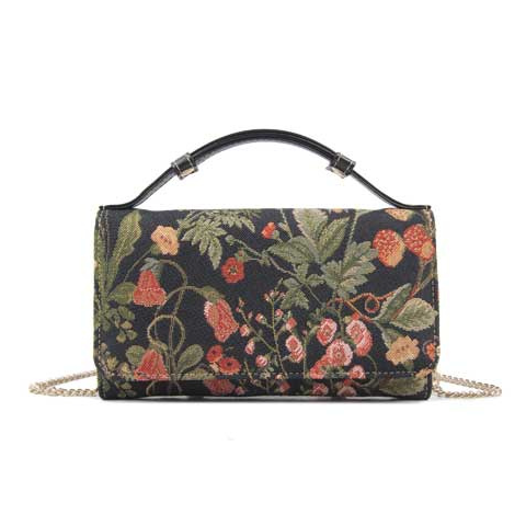 A Henney Bear FLORAL SUMMER BLACK kézi- és válltáska elegáns, mégis természetközeli megjelenést kínál részletgazdag virág- és bogyómintáival. A fekete alapszínen elhelyezkedő gobelin szövet gazdag színei látványos kontrasztot alkotnak, amelyet fekete műbőr elemek és finom aranyszínű részletek tesznek teljessé.