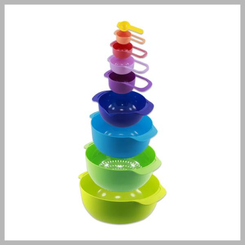 Herzberg 9 részes mérőpohár és tál készlet HG-BOL9N1Ez a praktikus és helytakarékos 9 részes ételkészítő készlet tökéletes választás minden konyhába. A készlet kis és nagy keverőtálakat, valamint különböző méretű mérőpoharakat és kanalat tartalmaz, így megkönnyíti a sütés-főzés előkészítését. A kis keverőtál kifolyóval rendelkezik, amely precíz öntést biztosít. A műanyag szűrő segítségével egyszerűen lecsöpögtetheti a hozzávalókat.A
