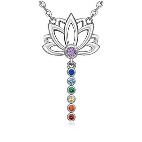 Gyönyörű ezüst színű 7 csakra medál, lótuszvirág mintával és a csakrák színeivel. Tökéletes kiegészítő a harmónia és spiritualitás jegyében