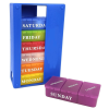 Termék jellemzői: - Műanyag - 7 egyenként kiszedhető napi adagoló - napok 3 részre osztva - Zsanéros fedéllel nyitható - naponként más szín - angol/német felírat - működése: a legalsót ki kell oldalra húzni, a nap folyamán a három rekeszt időszerűen üríte