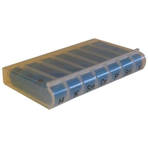 Termék jellemzői: - Nagyméretű adagoló azok számára, akik nehezebben tapintanak - Heti kiadagolásra alkalmas - Napi 4x-i alkalomra adagolható ki - A napi adagoló külön kivehető - A napi adagolók egy műanyag áttetsző dobozban vannak. A fedele kinyitását kö
