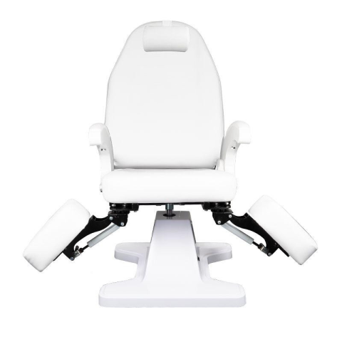 Pedikűr szék, modern stílusban, fehér műbőr kárpittal, hidraulikusan állítható magasítással, állítható háttámlával, és osztott lábtartóval. A lábtartó oldalra kihajtható, ezzel segítve a lábáztatást, illetve előre is csúsztatható, így különböző magasságú