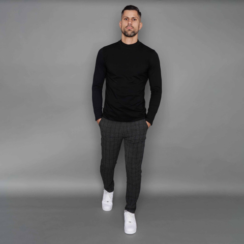 Slim Fit szabású magas nyakú hosszú ujjú póló , bordás passzés kézelővel és szegéllyel Modell: 185 cm/ 85 kg/ L-es méret