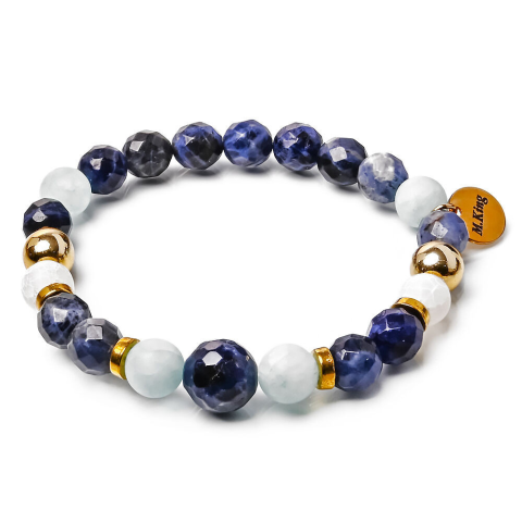 RUGALMAS KARKÖTŐ, a mérete választható.Az ékszer ásványai és tartozékai:– 8 mm-es fazettált kék szodalit ásványok– 8 mm-es matt kék jade gyöngyök– 8 mm-es roppantott fehér tűz achát gyöngyök– 8 mm-es arany színű hematit gy