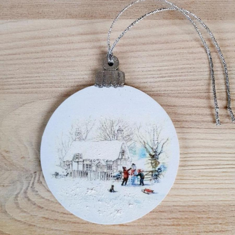 Fa alapra dekupázstechnikával készített karácsonyfadísz, hópasztával, csillámmal díszítve.