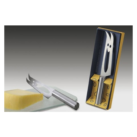 Rozsdamentes acélból készült, 25 cm hosszú sajtkés, pengéjén a jellegzetes Hogri mosollyal.
