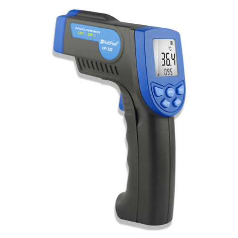 Infravörös hőmérsékletmérő, -30°C/+320°C, kijelzés C°-ban és F°-ban. Az infravörös hőmérséklet érzékelés segítségével érintés nélkül mérhető meg szilárd vagy folyékony tárgyak hőmérséklete. A pisztoly szerű kialakítás lehetővé teszi, hogy pontosan az a