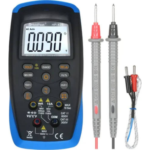 - Mért értékek: AC/DC feszültség, áramerősség, dióda, ellenállás, akkumulátor teszt, hőmérséklet.
