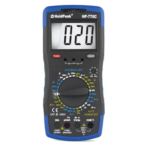 Digitális multiméter, VAC,VDC,AAC,ADC,ellenállás,kapacitás,induktivitás,feszültség kereső. Univerzális, digitális mérőműszer. A méréshatárok manuálisan állíthatók be. A nagy LCD kijelzőről könnyen leolvashatók a mért adatok. Egyenfeszültség, egyenáram,
