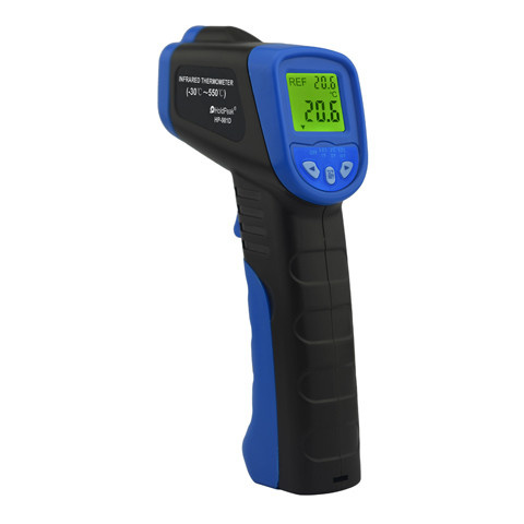 Infravörös hőmérsékletmérő, -50°C/+550°C, +/-2%, C° és F° kijelzés. Az infravörös hőmérséklet érzékelés segítségével érintés nélkül mérhető meg szilárd vagy folyékony tárgyak hőmérséklete. A pisztoly szerű kialakítás lehetővé teszi, hogy pontosan az ad
